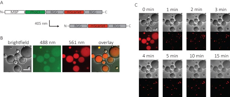 We constructed light-activated membraneless organelles using the recombinant protein PhoCl attached to RGG dimers, which Ben Schuster had previously engineered to coacervate. Ellen Reed inserted PhoCl between the solubilizing maltose binding protein and RGG-dimer, with an integrated mScarlet as a reporter tag. After illumination with light at 405 nm, PhoCl is cleaved and RGG-dimers form membraneless organelles! Work done in collaboration with Matt Good. https://pubs.acs.org/doi/abs/10.1021/acssynbio.9b00503